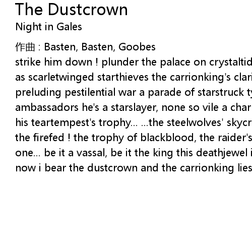| strike him down ! plunder the palace on crystaltide' s eve ! brigants be crowned as scarletwinged starthieves the carrionking' s clarions are chanting from afar preluding pestilential war a parade of starstruck tyrants and havoc' s ambassadors he' s a starslayer, none so vile a charming chaser of the furyspies his teartempest' s trophy... ... the steelwolves' skycries bring me the head of the firefed ! the trophy of blackblood, the raider' s razorsoul the fearfeathered one... be it a vassal, be it the king this deathjewel is my poisoned sting..!! now i bear the dustcrown and the carrionking lies bleeding..! |
