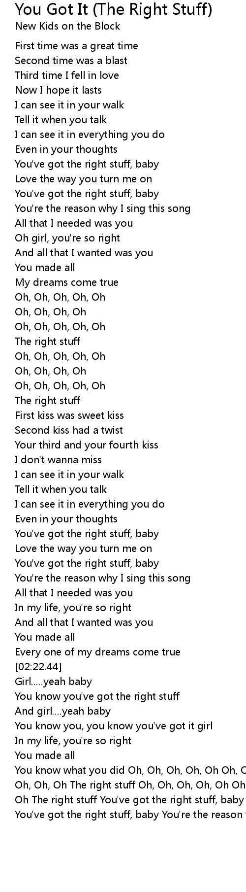 You know what you did Oh, Oh, Oh, Oh, Oh Oh, Oh, Oh, Oh, Oh Oh, Oh, Oh, Oh, Oh The right stuff Oh, Oh, Oh, Oh, Oh Oh, Oh, Oh, Oh, Oh Oh, Oh, Oh, Oh, Oh The right stuff You've got the right stuff, baby Love the way you turn me on You've got the right stuff, baby You're the reason why I sing this song |