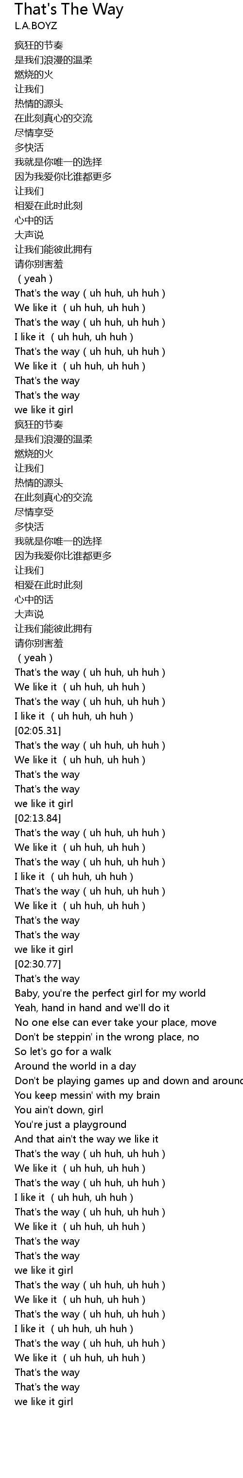 | [02:17.99] | That's the way(uh huh, uh huh) |