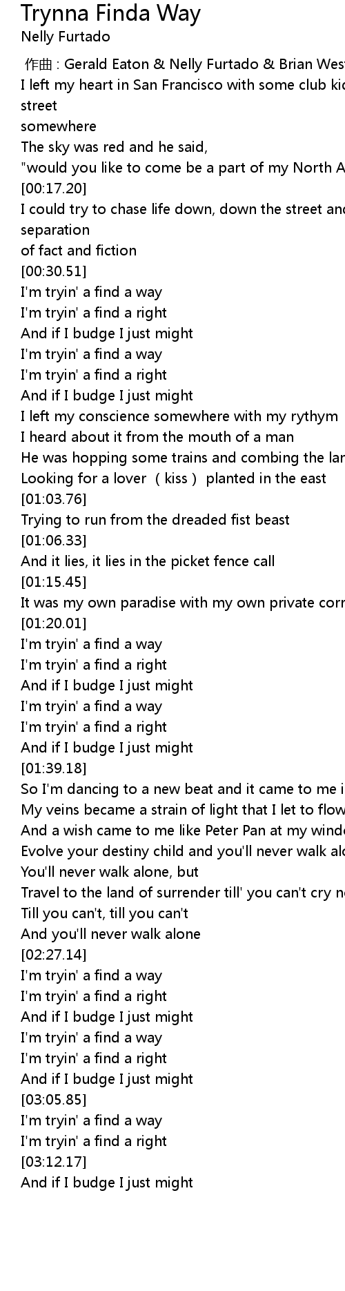 | [00:00.00] | 作曲 : Gerald Eaton & Nelly Furtado & Brian West |