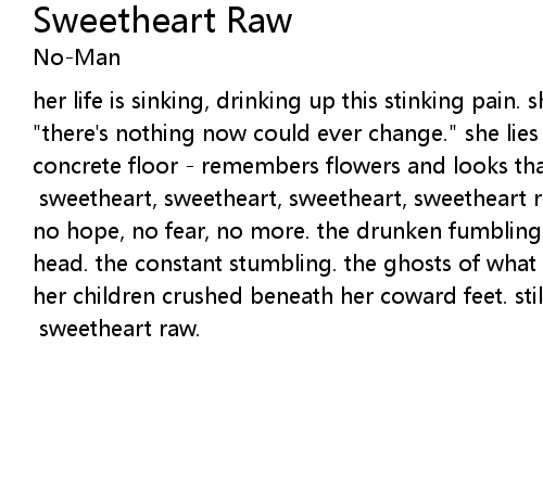 her life is sinking, drinking up this stinking pain. she gets to thinking, "there's nothing now could ever change." she lies for hours, crashed upon the concrete floor - remembers flowers and looks that left her sweet heart raw. [chorus:] sweetheart, sweetheart, sweetheart, sweetheart raw - no hope, no fear; no hope, no fear, no more. the drunken fumbling, the shaking hands and shaken head. the constant stumbling. the ghosts of what she should have said. she sees her children crushed beneath her coward feet. still not forgiven, she's broken by her heart's sweet beat. [chorus x2] sweetheart raw. |