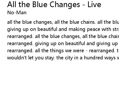 | all the blue changes, all the blue chains. all the blue changes rearranged. giving up on beautiful and making peace with strange, all the blue changes rearranged. all the blue changes, all the blue chains. all the blue changes rearranged. giving up on beautiful and giving up on pain. all the blue changes rearranged. all the things we were - rearranged. the city in a hundred ways, it wouldn't let you stay. the city in a hundred ways would never let you stray. |