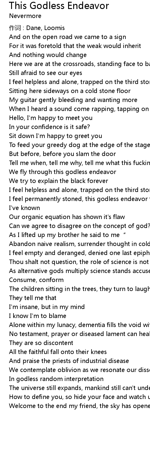 | I feel permanently stoned, this godless endeavor the only cage | |