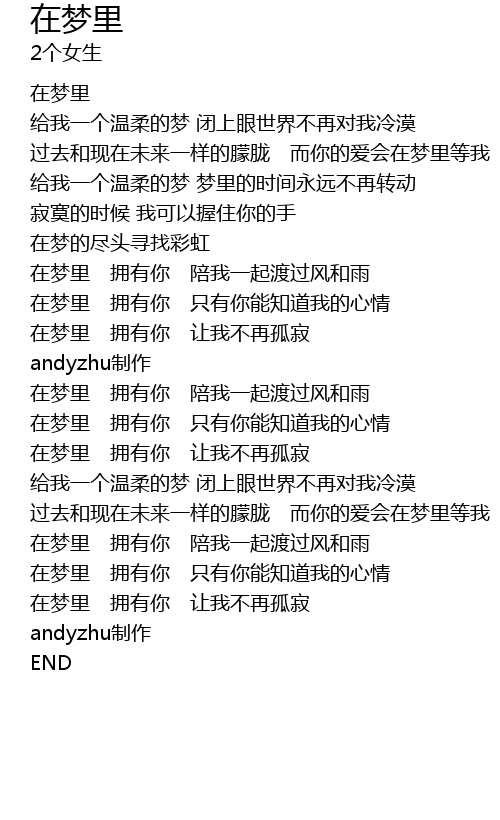 | [01:08.37] | 在梦里 拥有你 陪我一起渡过风和雨 |