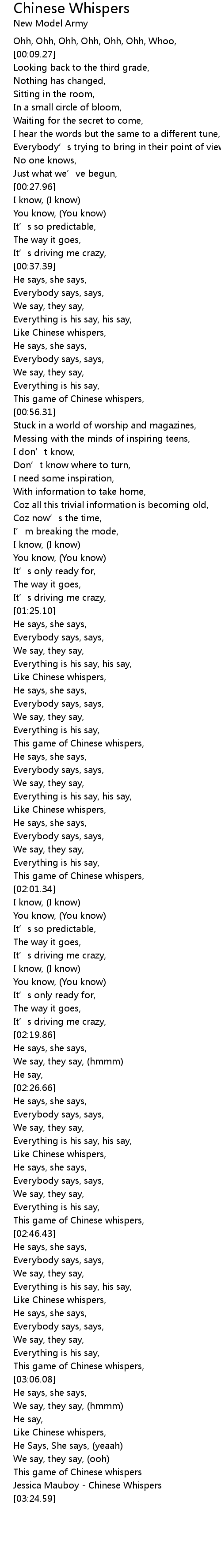 | [03:13.31] | Like Chinese whispers, |