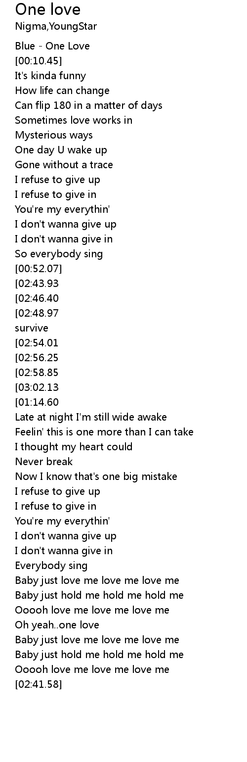 | [03:19.11][02:58.85][02:13.77][01:08.17] | One love oh I do believe |