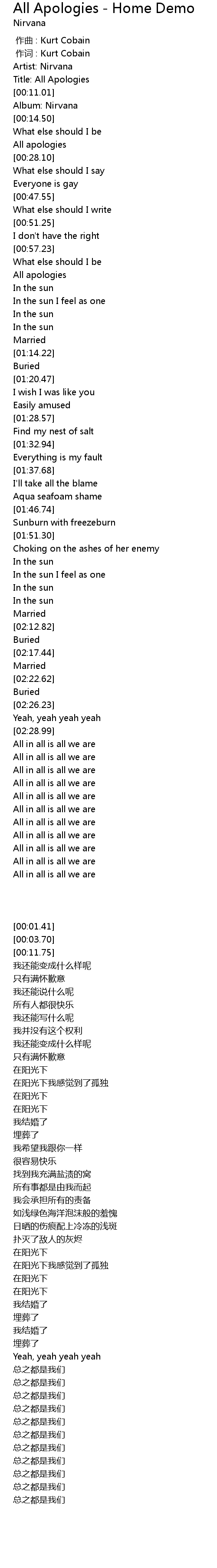 | [00:03.70] | Title: All Apologies |