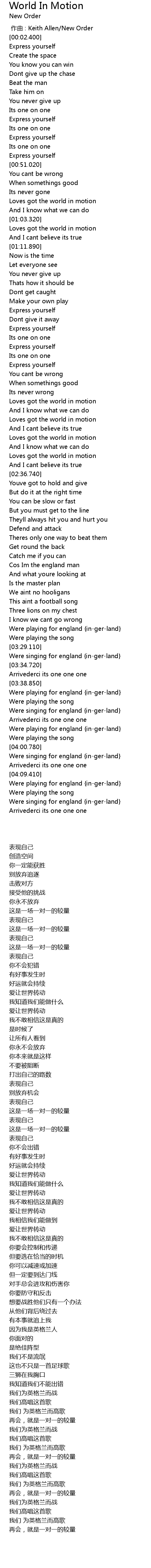 | [04:02.470] | Were singing for england {in-ger-land} |