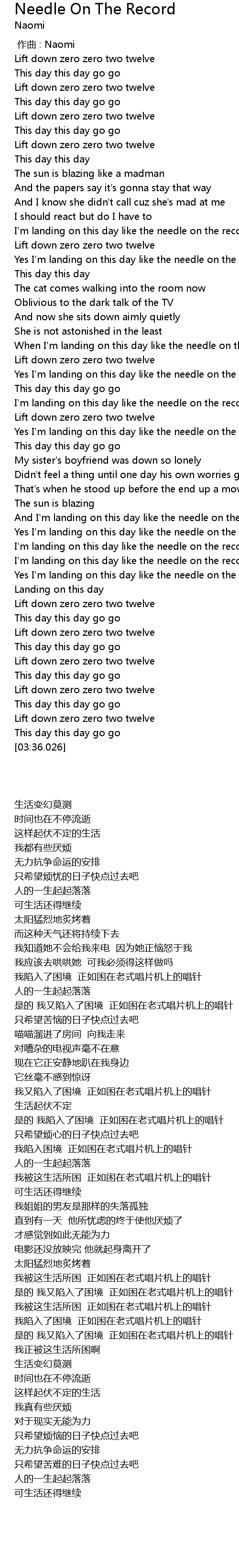 | [02:32.007] | I' m landing on this day like the needle on the record |