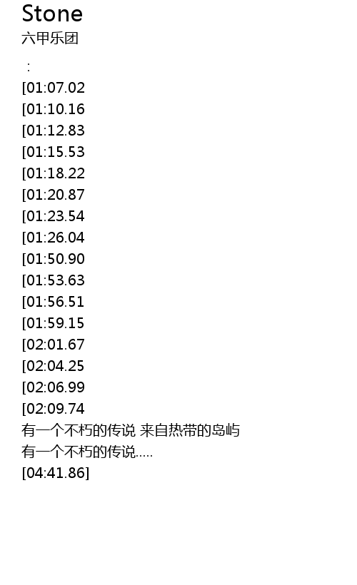 | [03:05.82][01:07.02] | 有一个不朽的传说 来自热带的岛屿 |