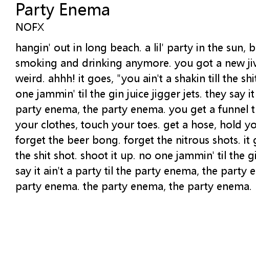 hangin' out in long beach. a lil' party in the sun, but ya just can't sit there smoking and drinking anymore. you got a new jive. all your friends are getting weird. ahhh! it goes, "you ain't a shakin till the shit shot. shoot it up. no one jammin' til the gin juice jigger jets. they say it ain't a party til the party enema, the party enema. you get a funnel tube, pour in a 40 oz. pull down your clothes, touch your toes. get a hose, hold your nose. its a party hat. forget the beer bong. forget the nitrous shots. it goes "you ain't a shakin till the shit shot. shoot it up. no one jammin' til the gin juice jigger jets. they say it ain't a party til the party enema, the party enema. the party enema, the party enema. the party enema, the party enema. |