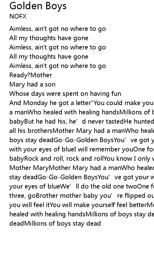 | And Monday he got a letter" You could make yourself feel better" Mother Mary had a manWho healed with healing handsMillions of boys lay deadMother Mary had a babyBut he had his, he' d never tastedHe hunted all the othersThen he hunted all his brothersMother Mary had a manWho healed with healing handsMillions of boys stay deadGoGoGolden BoysYou' ve got your war toysLooking straight onAnd with your eyes of blueI will remember youOne for me, one for youMother Mary, babyRock and roll, rock and rollYou know I only want youFor your rock and roll, Mother MaryMother Mary had a manWho healed with pleasing handsMillions of boys stay deadGoGoGolden BoysYou' ve got your war toysLooking straight onAnd with your eyes of blueWe' ll do the old one twoOne for me, one for youOne, two, three, goBrother mother baby you' re flipped outYou' re over influencedOne day you will feel itYou will make yourself feel betterMother Mary had a manWho healed with healing handsMillions of boys stay deadMillions of boys stay deadMillions of boys stay dead |