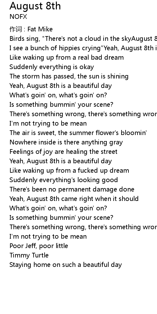 | Birds sing, " There' s not a cloud in the skyAugust 8th is a beautiful day" | |