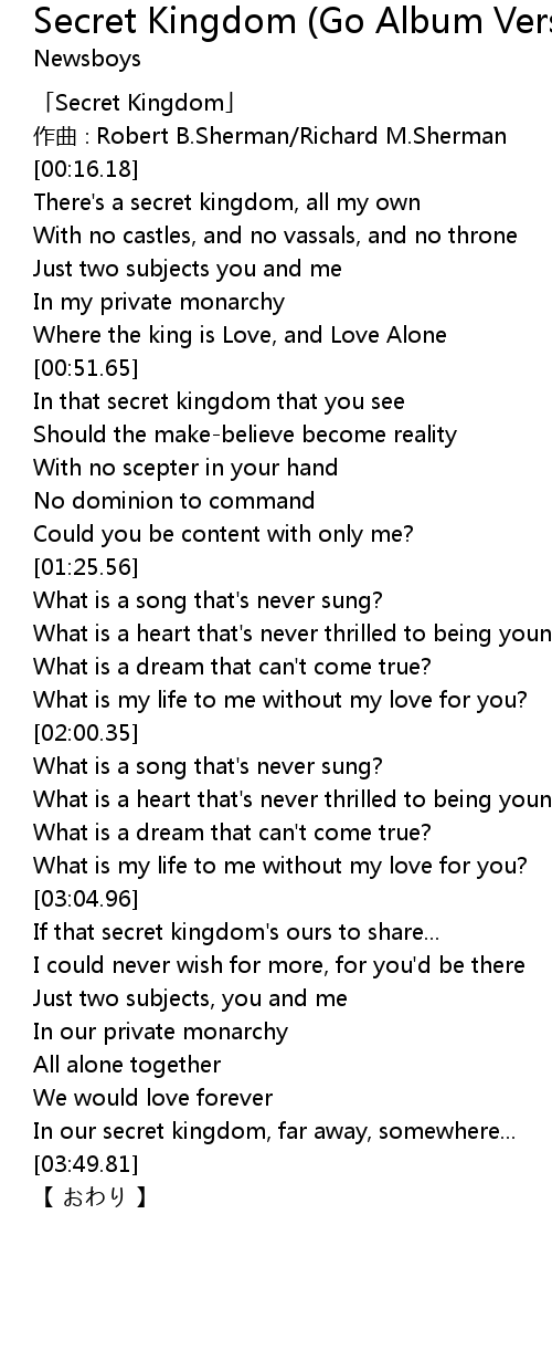 | [03:38.65] | In our secret kingdom, far away, somewhere... |