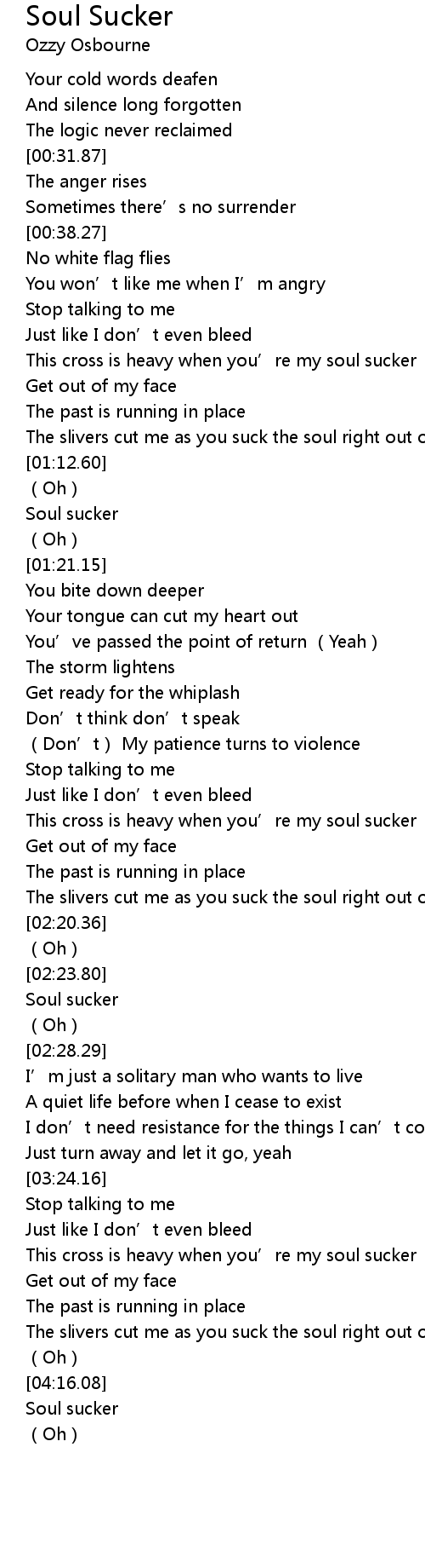 | [02:00.02] | This cross is heavy when you’re my soul sucker |