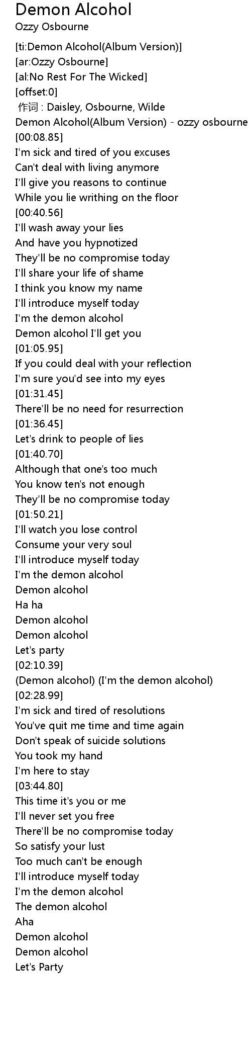 | [00:00.92] | Demon Alcohol Album Version ozzy osbourne |