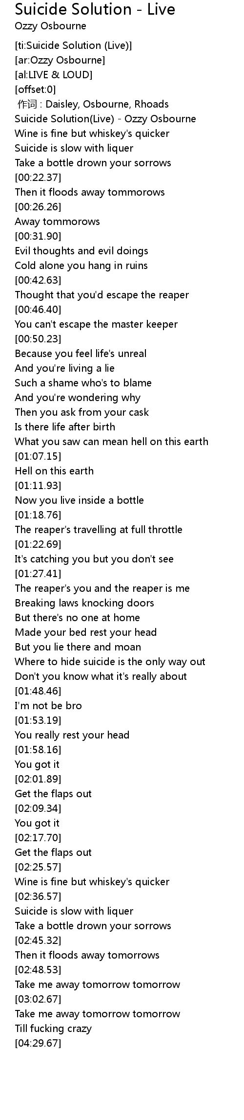 | [00:01.00] | Suicide Solution(Live) - Ozzy Osbourne |