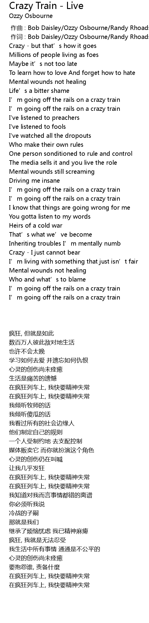 | [00:01.00] | 作词 : Bob Daisley/Ozzy Osbourne/Randy Rhoads |
