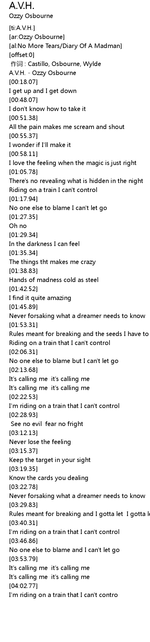 | [00:15.51] | A.V.H. - Ozzy Osbourne |