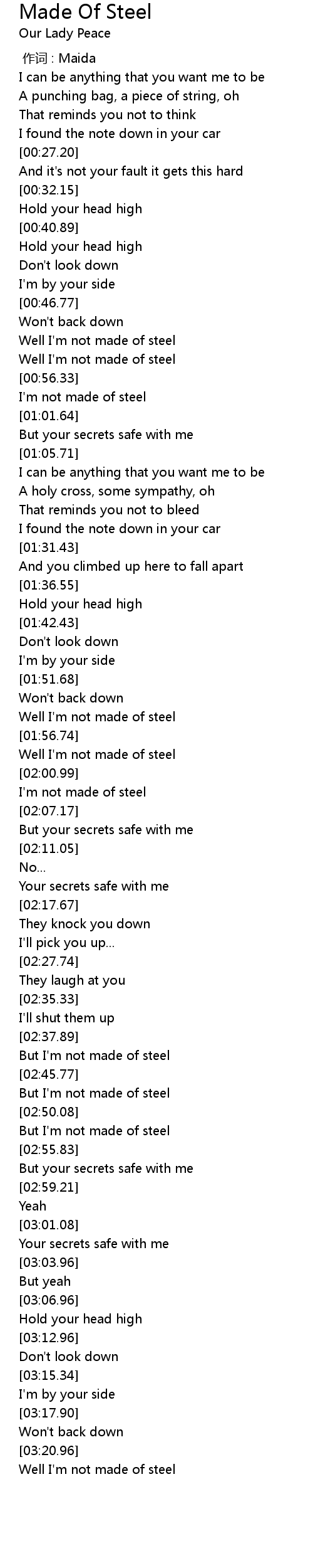 | [00:50.77] | Well I' m not made of steel |