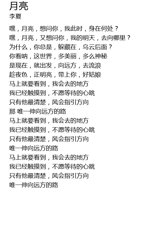 | [00:51.770] | 嘿,月亮,又想问你,我的明天,去向哪里? |