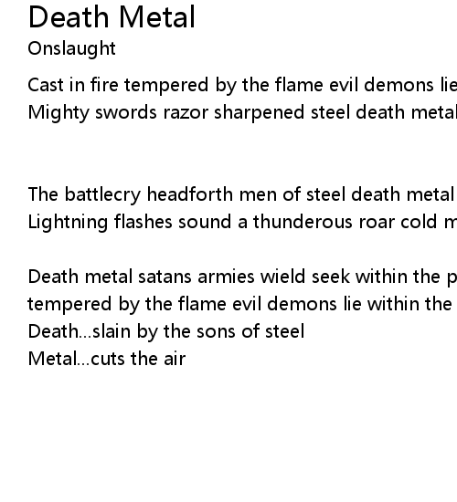 Death metal satans armies wield seek within the powers of the steel cast in fire tempered by the flame evil demons lie within the blade |