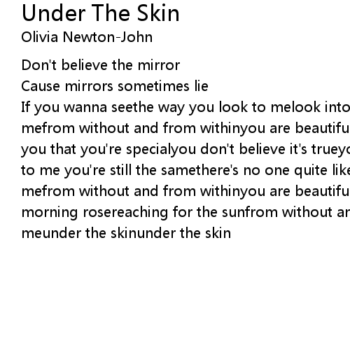 | If you wanna seethe way you look to melook into my eyesyou are beautiful to mefrom without and from withinyou are beautiful to meunder the skinwhen i tell you that you're specialyou don't believe it's trueyou only see what's changedbut to me you're still the samethere's no one quite like youyou are beautiful to mefrom without and from withinyou are beautiful to meunder the skinlike a morning rosereaching for the sunfrom without and from withinyou are beautiful to meunder the skinunder the skin |