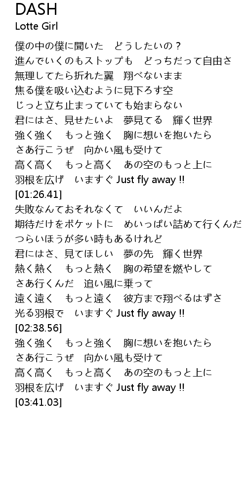 | [03:33.63] | 羽根を広げ いますぐ Just fly away !! |