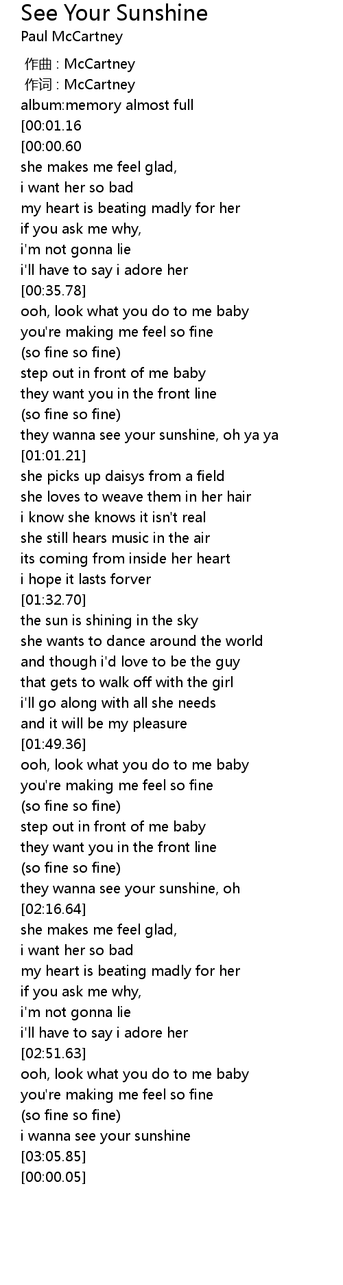| [03:07.00][00:01.16] | paul mccartneyrsee your sunshine |