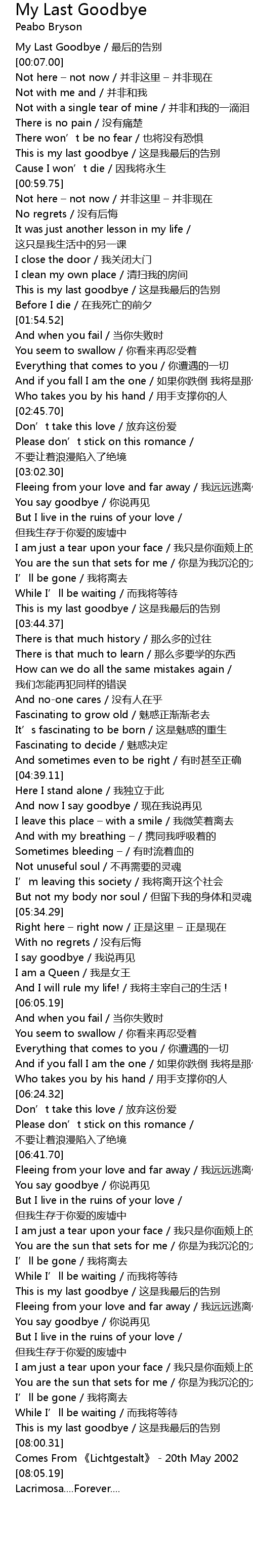 | [00:02.00] | My Last Goodbye zuì hòu de gào bié |