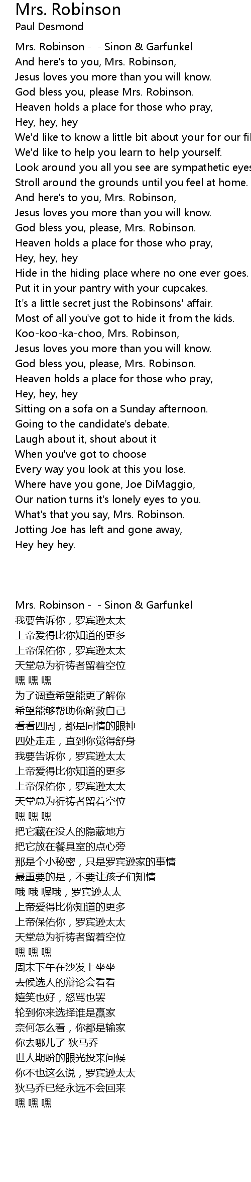 | [00:43.68] | God bless you, please Mrs. Robinson. |