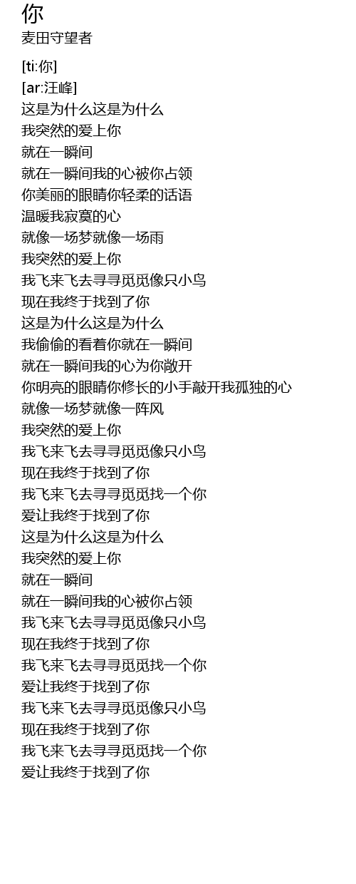 | [01:51.923] | 我飞来飞去寻寻觅觅找一个你 |