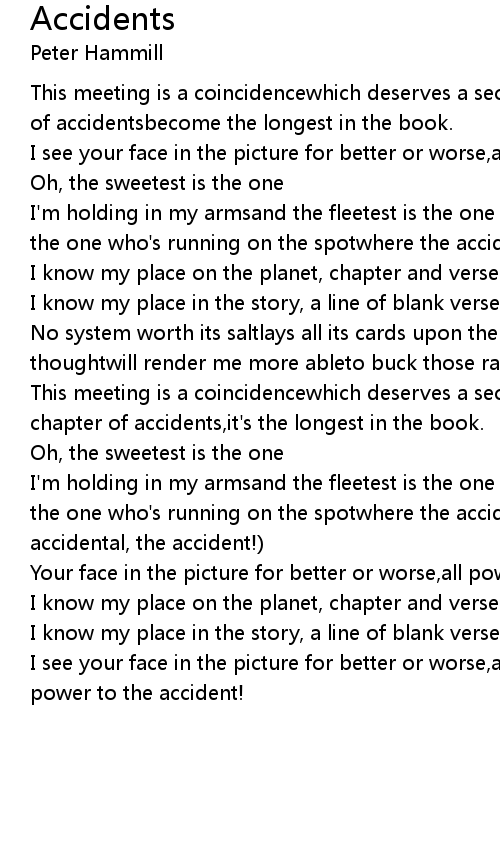 | I' m holding in my armsand the fleetest is the one who survivesbut the meetest is the one who' s running on the spotwhere the accident' s about to arrive... The accidental, the accident! | |