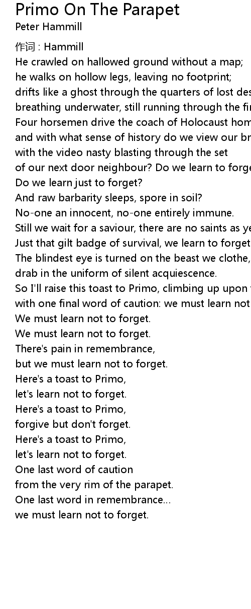 | So I' ll raise this toast to Primo, climbing up upon the parapet | |