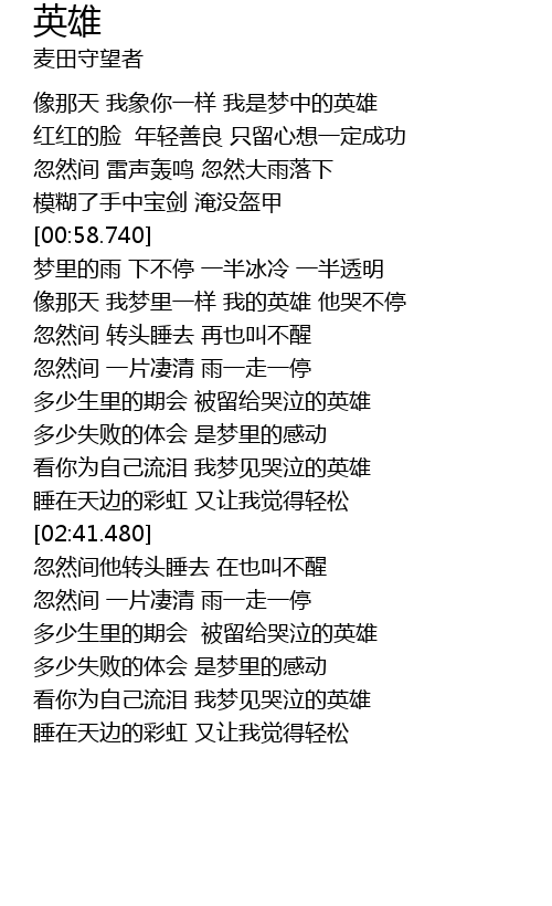 | [00:18.440] | 像那天 我象你一样 我是梦中的英雄 |
