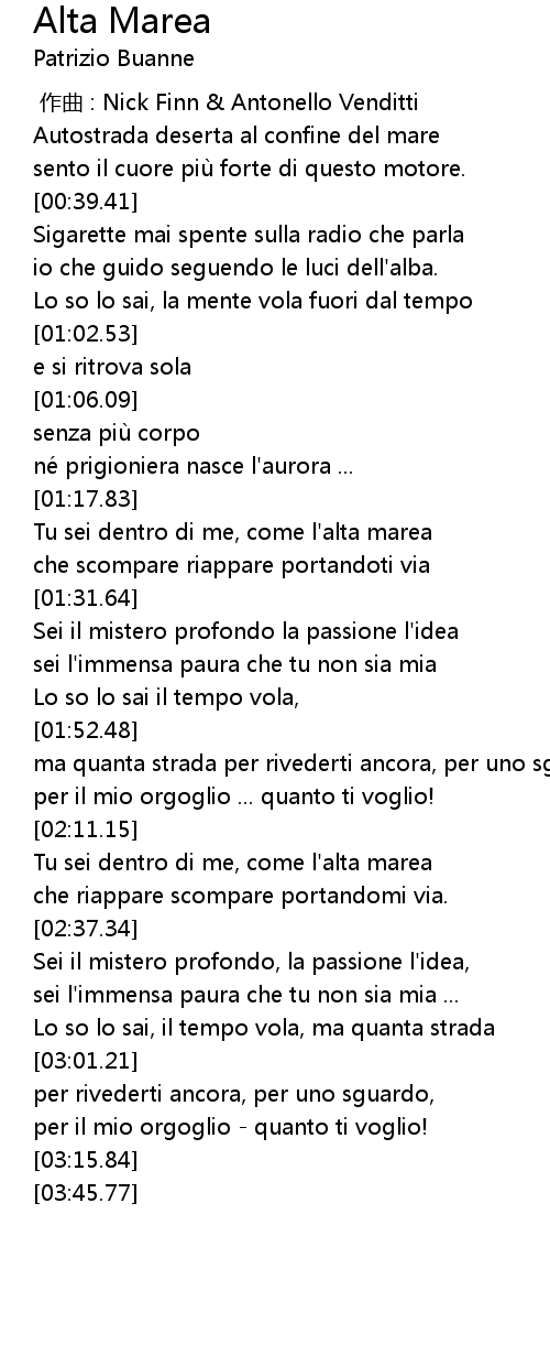 | [02:26.96] | Tu sei dentro di me, come l' alta marea |