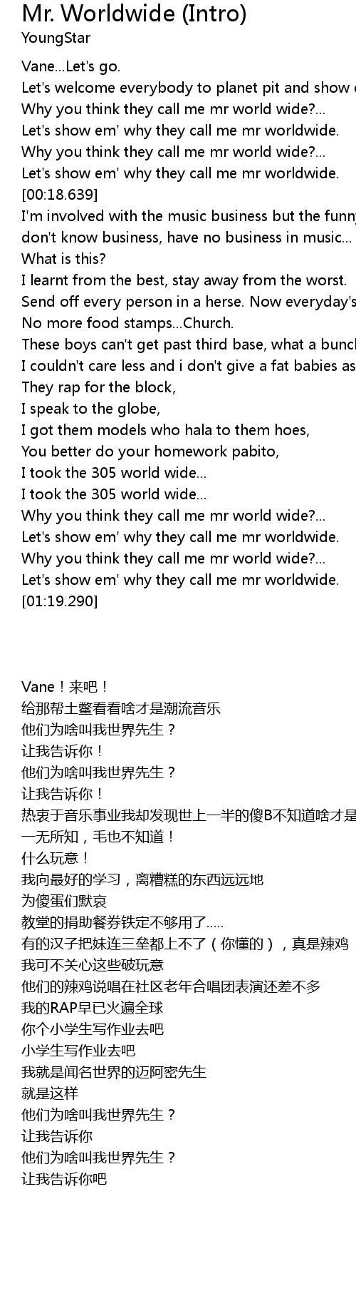 | [00:04.740] | Why you think they call me mr world wide?... |