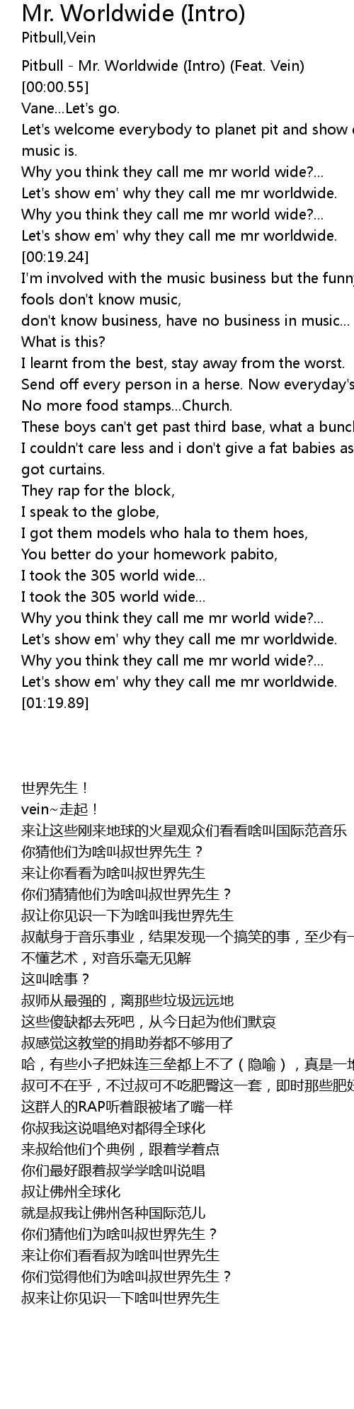 | [00:00.02] | Pitbull - Mr. Worldwide (Intro) (Feat. Vein) |