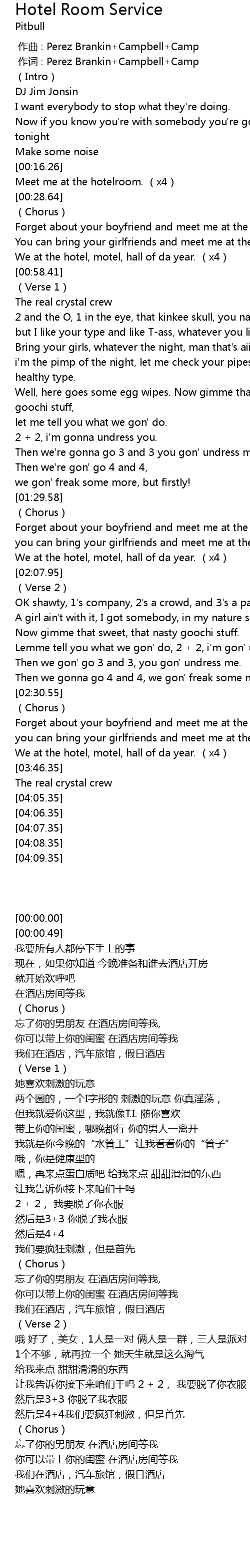 | [00:33.46] | You can bring your girlfriends and meet me at the hotelroom. x2 |