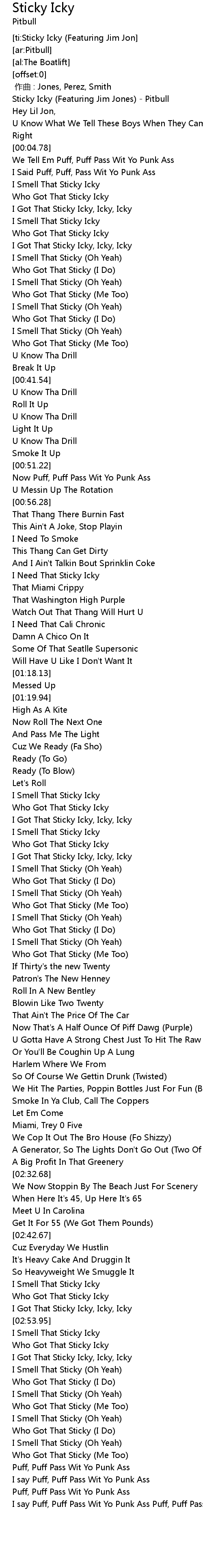 | [00:00.33] | Sticky Icky (Featuring Jim Jones) - Pitbull |