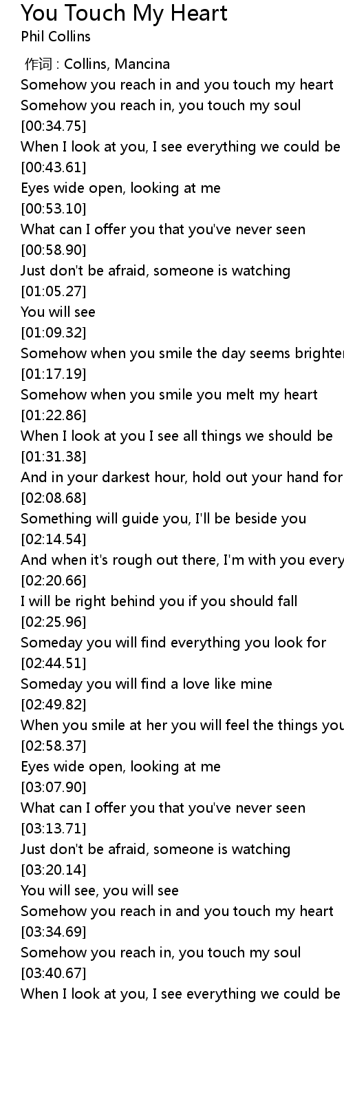 | [03:30.20] | Somehow you reach in and you touch my heart |