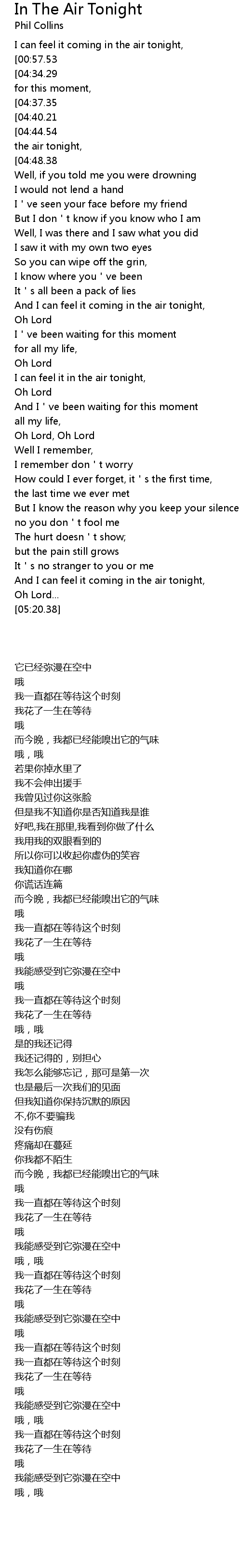 | [00:50.94] | I can feel it coming in the air tonight, |