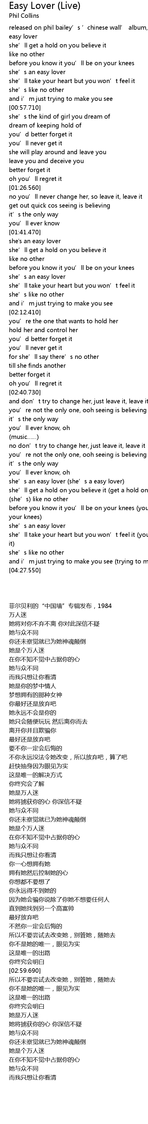 | [00:00.990] | released on phil bailey' s ' chinese wall' album, 1984 |