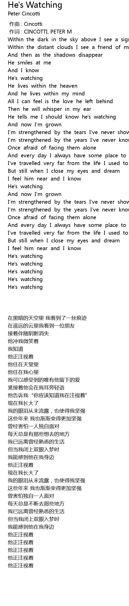 | [01:22.352] | He tells me I should know he' s watching |