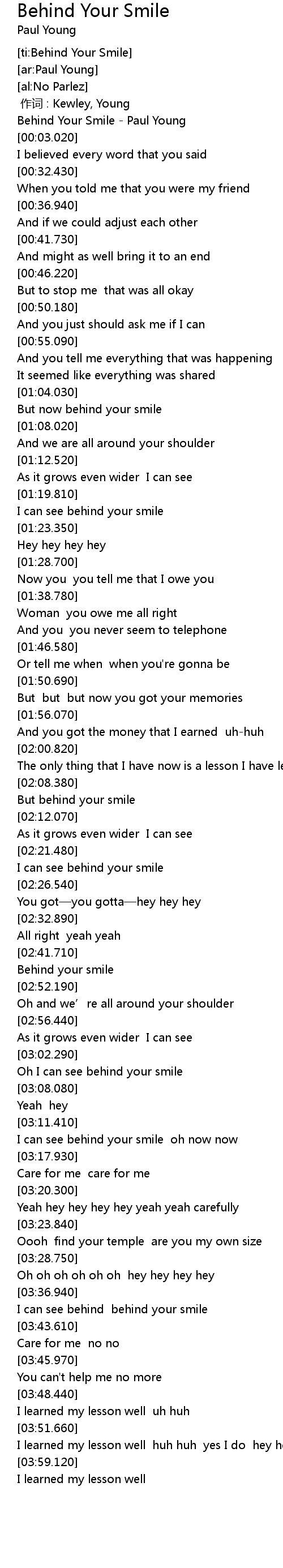 | [00:01.770] | Behind Your Smile - Paul Young |