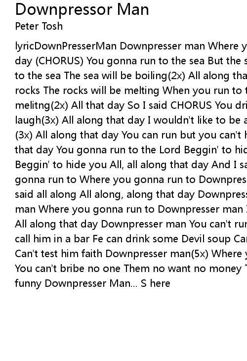 lyricDownPresserMan Downpresser man Where you gonna run to (3x) All along that day (CHORUS) You gonna run to the sea But the sea will be boiling When you run to the sea The sea will be boiling(2x) All along that day You gonna run to the rocks The rocks will be melting When you run to the rocks The rocks will be melitng(2x) All that day So I said CHORUS You drink your big champagne and laugh(3x) All along that day I wouldn't like to be a flea Under your collar man (3x) All along that day You can run but you can't hide(3x) Telling you all along that day You gonna run to the Lord Beggin' to hide you (2x) You gonna run to Jah Beggin' to hide you All, all along that day And I said Downpresser Man Where you gonna run to Where you gonna run to Downpresser man Where you gonna run to I said all along All along, along that day Downpresser man(4x) Wait, Downpresser man Where you gonna run to Downpresser man I don't know where you gonna run to All along that day Downpresser man You can't run, you can't bribe Jah-Jah Can't call him in a bar Fe can drink some Devil soup Can't bribe him to run a car now Can't test him faith Downpresser man(5x) Where you gonna run to Downpresser man You can't bribe no one Them no want no money Them run'f money That money get funny Downpresser Man... S here |
