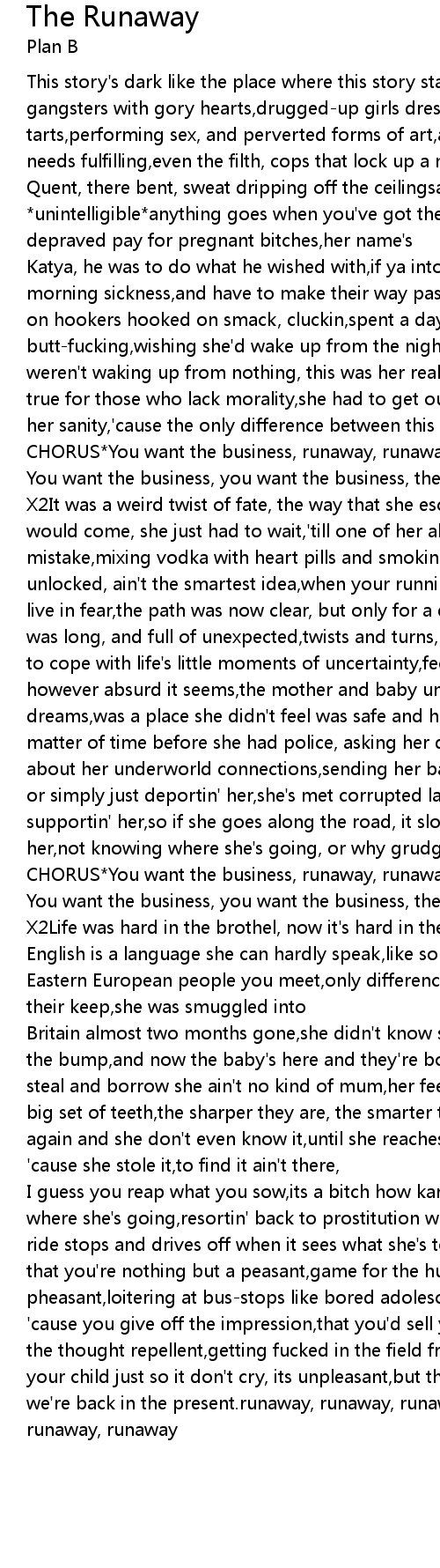 I guess you reap what you sow,its a bitch how karma works, it's hard to work out where she's going,resortin' back to prostitution when the traffic is flowin',her ride stops and drives off when it sees what she's towing,must be hard knowing that you're nothing but a peasant,game for the hunt, its the prairie like pheasant,loitering at bus-stops like bored adolescents,with sex on their mind, 'cause you give off the impression,that you'd sell yourself for money, not find the thought repellent,getting fucked in the field from behind, for you best feed your child just so it don't cry, its unpleasant,but that's what she did and now we're back in the present.runaway, runaway, runaway, runawayrunaway, runaway, runaway, runaway |