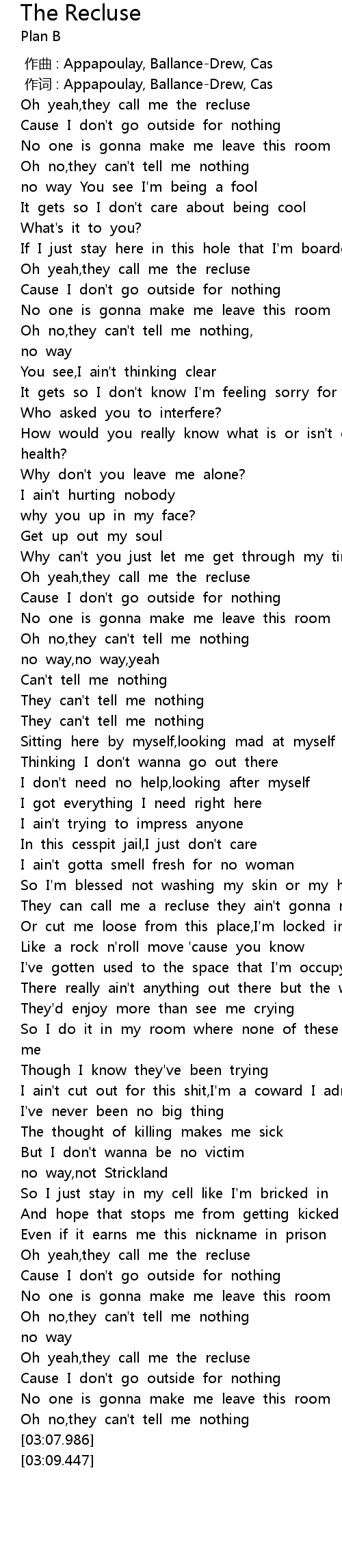 | [00:00.36] | Oh yeah,they call me the recluse |