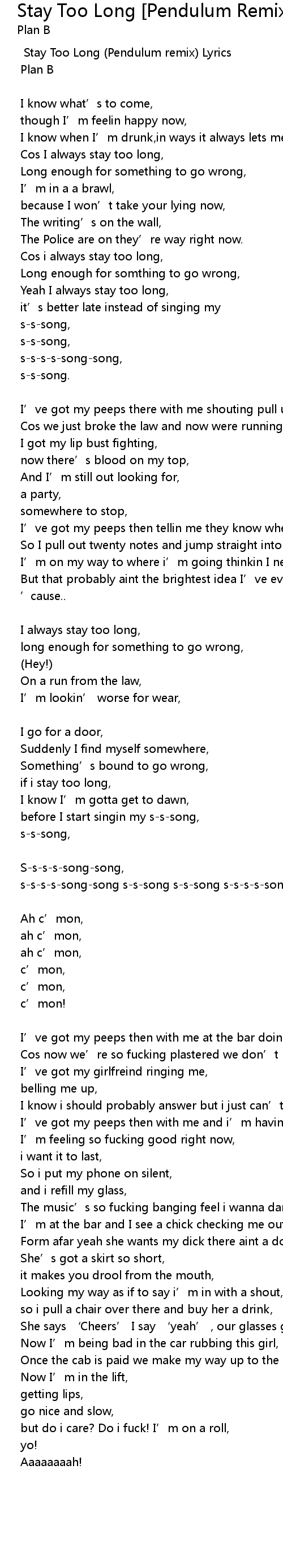 | Stay Too Long (Pendulum remix) Lyrics | |