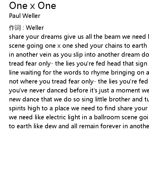 | share your dreams give us all the beam we need like electric light in a ballroom scene going one x one shed your chains to earth like dew and all remain forever in another vein as you slip into another dream don' t fear not not where you tread fear only the lies you' re fed head that sign for all of us who wait in line waiting for the words to rhyme bringing on a brand new day don' t fear not not where you tread fear only the lies you' re fed so dance little dancer like you' ve never danced before it' s just a moment we' re going through this is the new dance that we do so sing little brother and turn on everyone lift are spirits high to a place we need to find share your dreams give us all the beam we need like electric light in a ballroom scene going one x one shed your chains to earth like dew and all remain forever in another vein going on one x one |